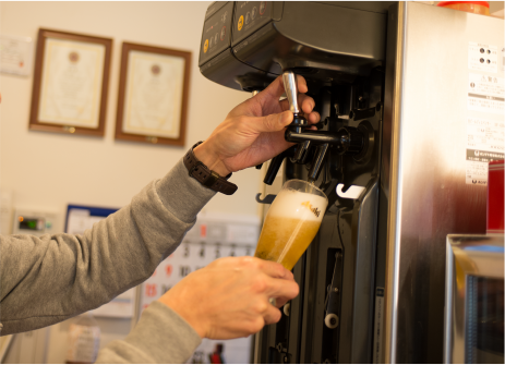 ラウンジ脇のカウンターで提供するビールは、ビアマイスターの資格を持つ私(BOBさん)が、一杯ずつサーブしています。生ビールの命は鮮度ですから、大きなビールタンクではなく、手間でも小さなビールタンクをこまめに取り替えて。最近では若い女性もよく飲んでいかれますが、一杯200円のミニサイズから用意していますので喜ばれています。銭湯業界に入ったのは2年くらい前で、それまでは自営でバイクパーツやアクセサリーなどをネット販売していました。最初は閉店後の掃除を手伝ってたんですが、リニューアルを機に本格的に手を貸して欲しいと言われ、店長に。カウンター業務の他に設備の維持管理まで任されていますが、下町の人情が心地よい日暮里で、新しい銭湯の魅力を創っていけたらと思います。