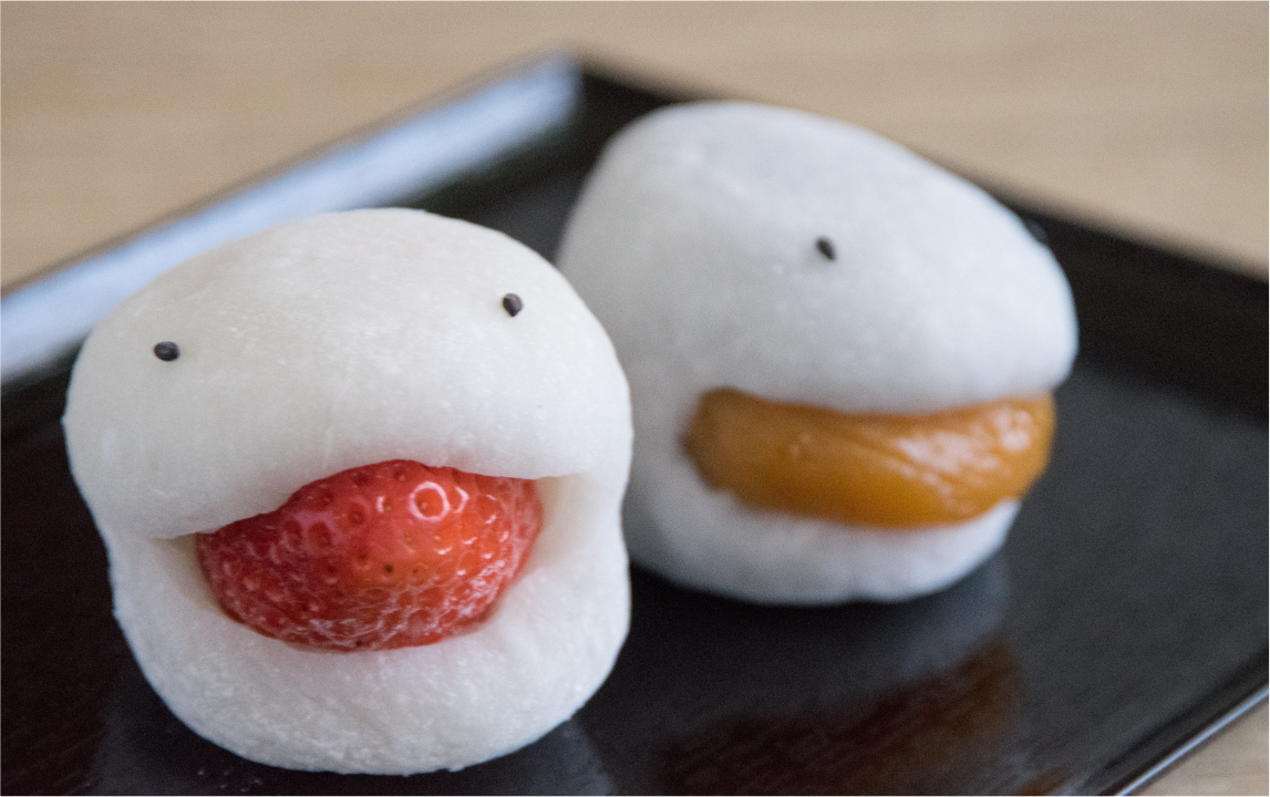 「江戸うさぎ」はもともと、日暮里にある本社(菓子問屋・株式会社大藤)で取扱っている商品を売る直売所を兼ねて、お饅頭の製造販売もやっていました。お饅頭の他に大福もラインナップに加えたいと提案し、いちごをすべて包んだタイプや、大福のてっぺんから少し見えてるものなど試行錯誤したんですが、なかなかオリジナリティが出なくて。 ある時いちごを横から覗かせたものを本社に提案したら、なんだか顔のように見えると言われて。試しに黒ごまで目を入れてみたらかわいくなってしまい、これだ!と。かわいいお化けみたいで、谷中霊園の近くと言うこともあり“妖怪大福”と名付けました。表情の決め手となる目の位置は、手作業なのでどうしても表情に多少のばらつきはでますが、それもまた商品の味だと思ってください(笑)。