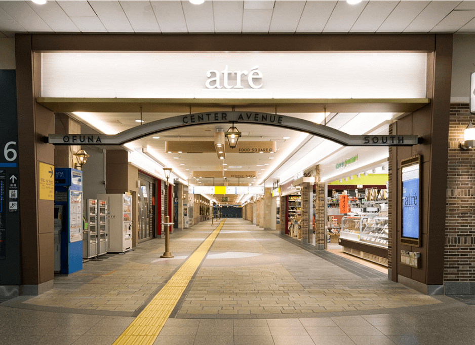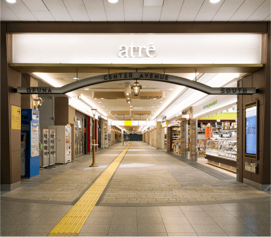 カフェやレストラン、食料品店が集まり、通勤通学時に気軽に立ち寄れる空間として人気の「アトレ大船」。南北を貫く通路「センターアベニュー」は石畳や街灯をあしらい、「湘南の風土や歴史を感じさせる散歩道」をイメージしています。